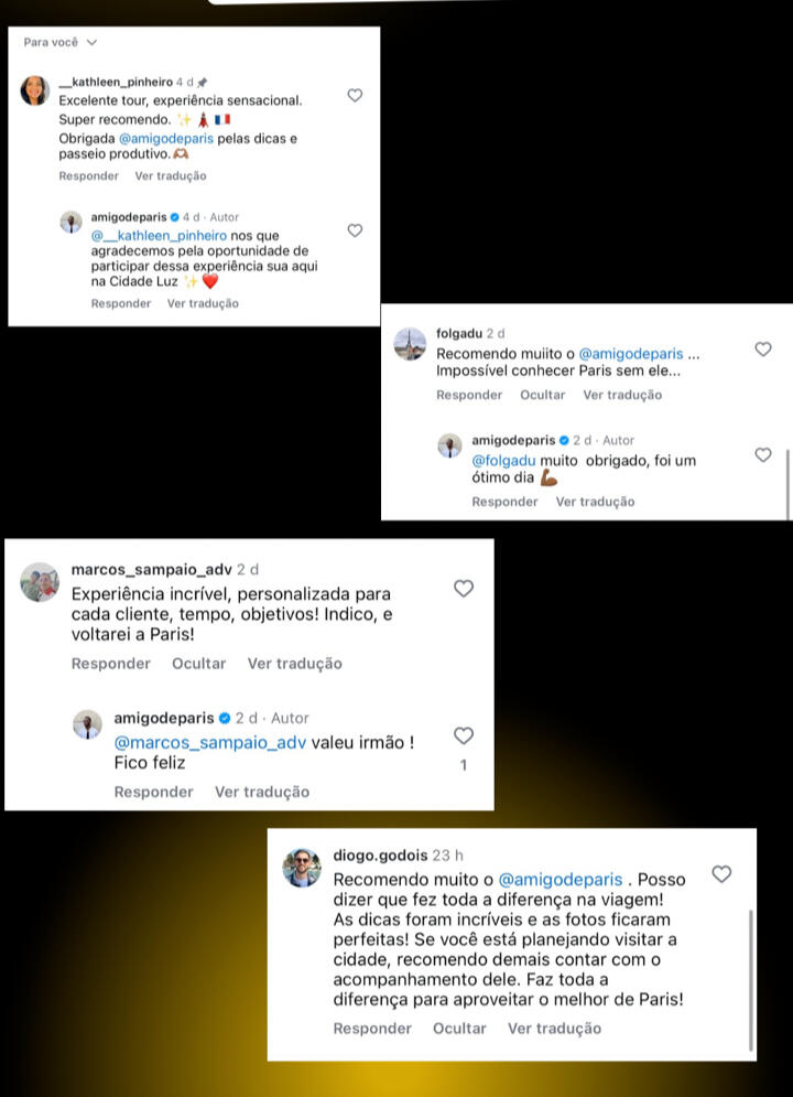 Criador do conceito "Amigo de Paris", minha proposta é simples : Apresentar Paris de um jeito diferenciado, descontraído e totalmente flexível, como se você estivesse passeando com um amigo que conhece a cidade inteira por dentro. Em vez de roteiros rígidos e impessoais, crio um experiencia personalizada para você, para que sua visita seja tão única quanto seus interesses.